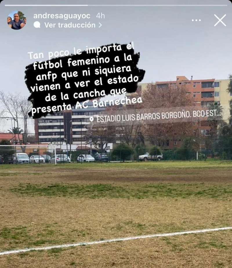 Una situación que irritó al entrenador de las hispanas, que en su cuenta de Instagram señaló que “tan poco le importa el fútbol femenino a la ANFP, que ni siquiera vienen a ver el estado de la cancha que presenta AC Barnechea”, además de adjuntar una foto del recinto.