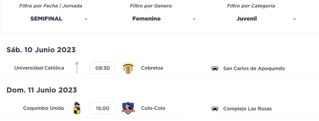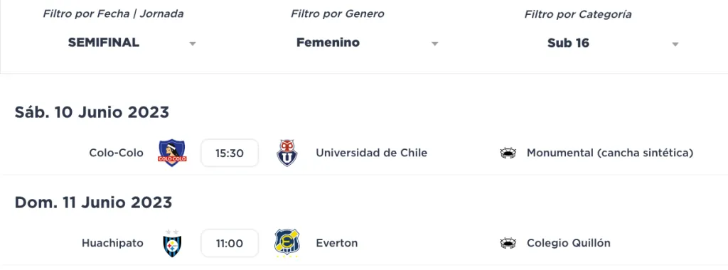 La ANFP confirmó la programación de las semis de las categorías Juvenil y Sub 16. Los cuatro desafíos se desarrollarán este fin de semana y serán a partido único; es decir, en caso de empate se definirá mediante penales quien es la clasificada a la final.
