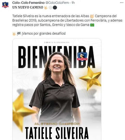 “Un nuevo camino. Tatiele Silveira es la nueva entrenadora de las Albas. Campeona del Brasileirao 2019, subcampeona de Libertadores con Ferroviária y además registra pasos por Santos, Gremio y Vasco da Gama”, sostuvo Colo Colo en su bienvenida a la ex futbolista.