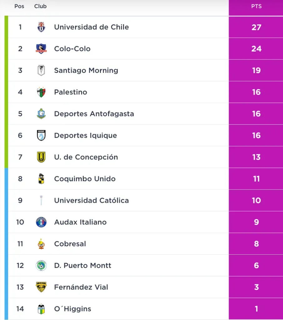 En el grupo B, por su parte, Coquimbo Unido va 8º con 11 unidades y cayó a la zona baja por primera vez. Le sigue la UC en el 9º puesto con 10 puntos y una ardua lucha por subir: Audax Italiano (10º, 9 ptos), Cobresal (11º, 8 ptos), Deportes Puerto Montt (12º, 6 ptos).