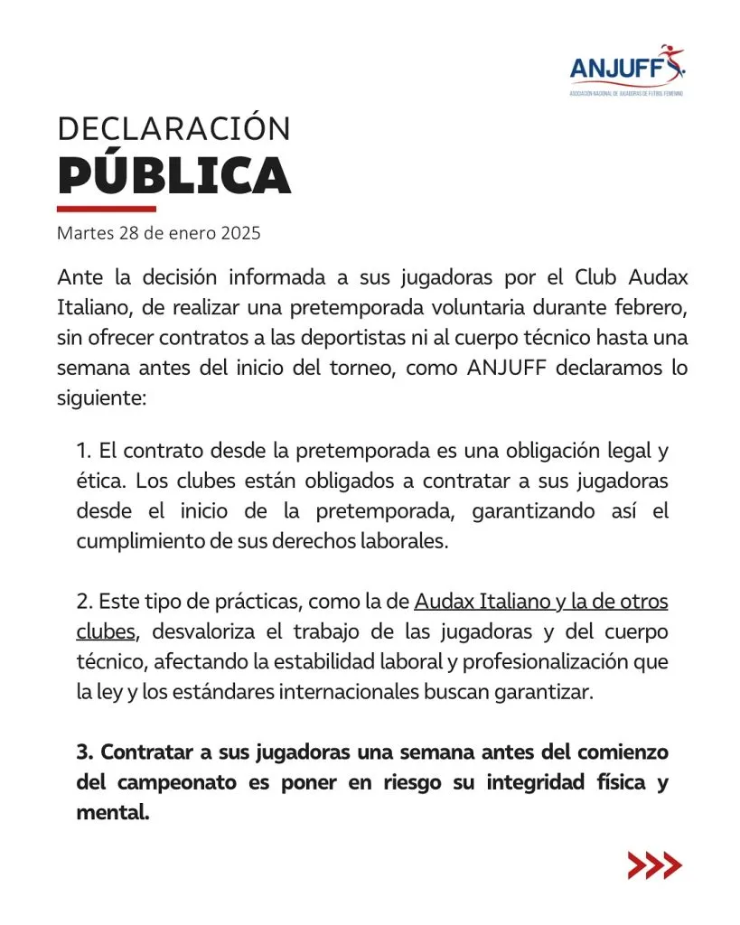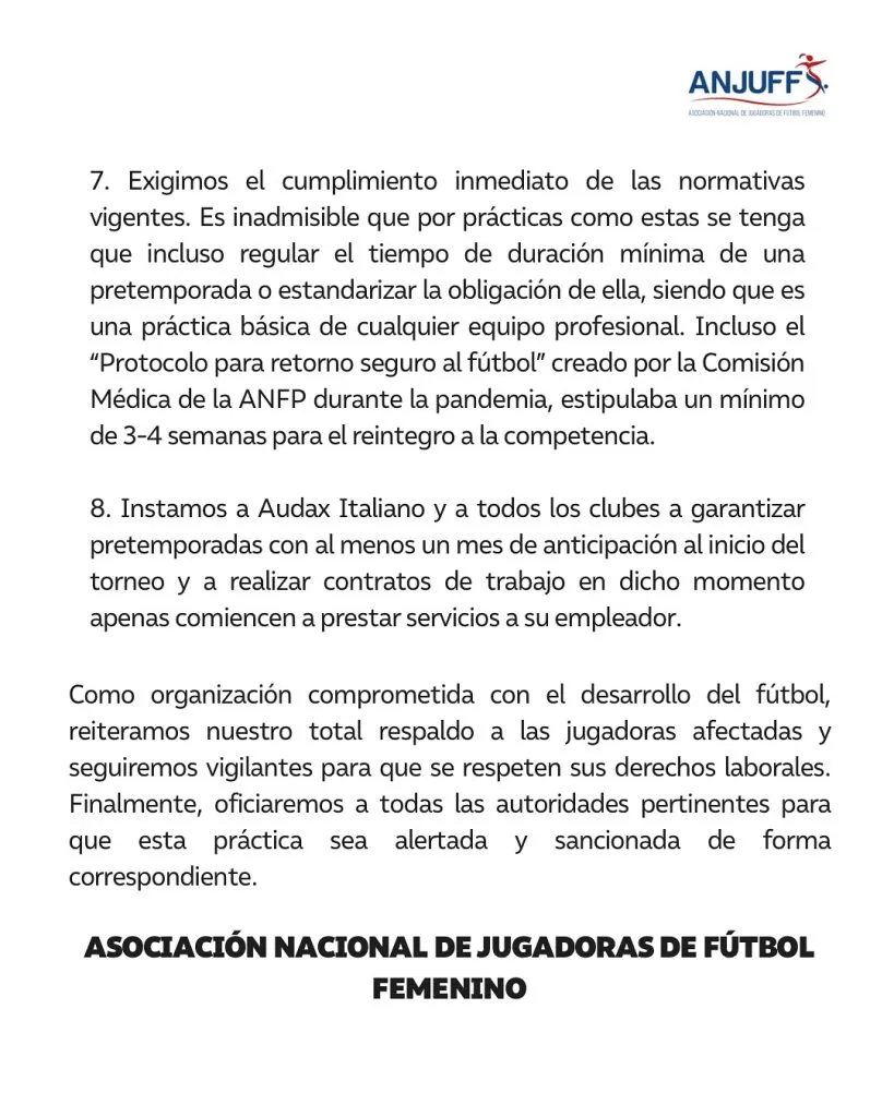 La Asociación Nacional de Jugadoras de Fútbol Femenino (ANJUFF) emitió una declaración pública denunciando las prácticas laborales de Audax Italiano, club que informó a su plantel que iniciará su pretemporada en febrero de forma “voluntaria”, sin ofrecer contratos a las jugadoras ni al cuerpo técnico hasta una semana antes del torneo.