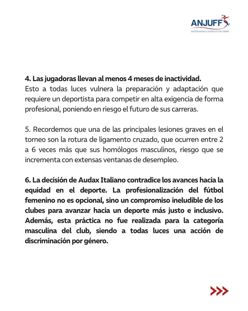 Según la visión de la ANJUFF, la decisión de Audax Italiano contradice los avances hacia la equidad en el deporte, pues esta práctica no fue realizada para la categoría masculina del club, por lo que a todas luces es discriminación de género: “La profesionalización del fútbol femenino no es opcional, es un compromiso legal y ético que los clubes deben cumplir”, sentenció García.
