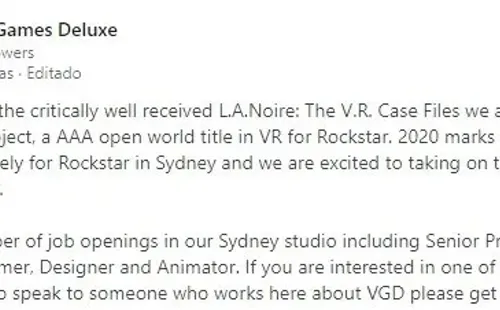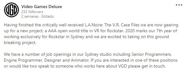 “Habiendo terminado el extraordinariamente bien recibido L.A.Noire: The V.R. Case Files, ahora nos estamos preparando para un nuevo proyecto, un título mundial abierto AAA de realidad virtual para Rockstar”