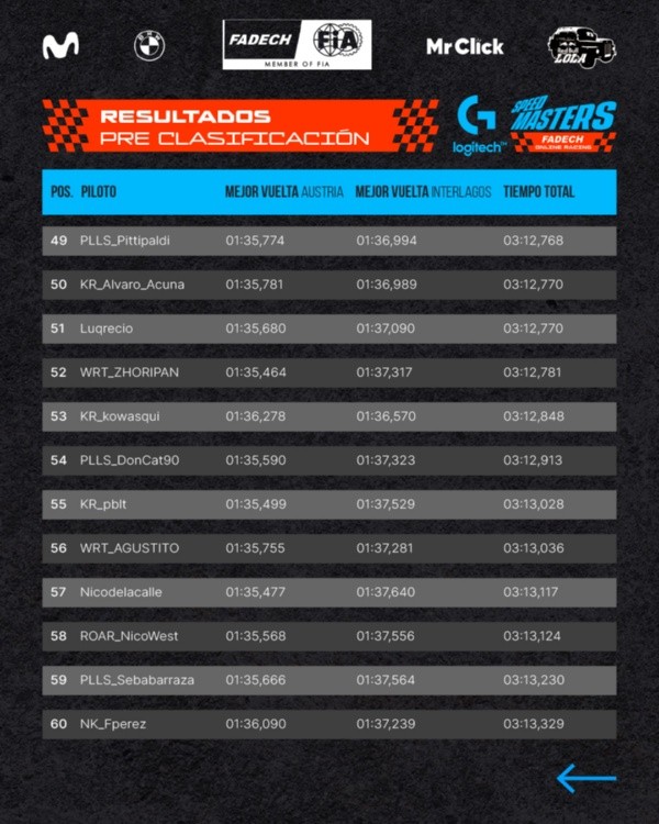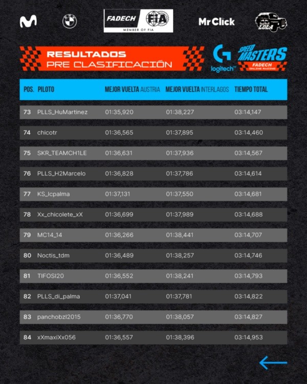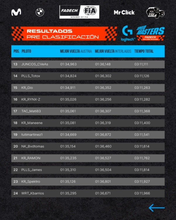 Los jugadores se enfrentaron utilizando el BMW Modelo M4 en las pistas de Austria (Sábado) e Interlagos (Domingo) para dar con los 96 clasificados, quienes serán divididos en ocho grupos de 12 pilotos.