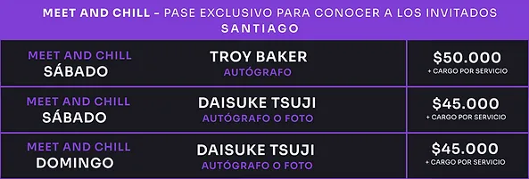 - ¡Ojo! Los “Meet and Chill” no da derecho a ingreso al evento, solamente da derecho a conocer al invitado seleccionado y en el día elegido.