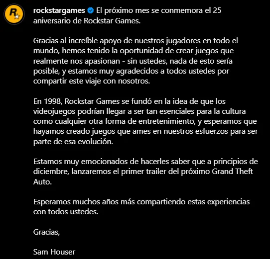 Junto con agradecer el apoyo de los jugadores de todo el mundo, el último párrafo del comunicado de Rockstar Games y Sam Houser, señala que “Estamos muy emocionados de hacerles saber que, a principios de diciembre, lanzaremos el primer tráiler del próximo Grand Theft Auto”.