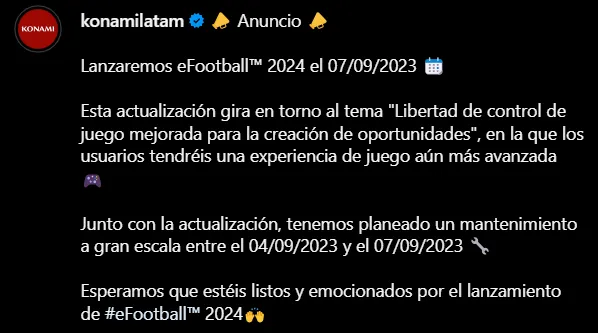 Según señala el comunicado publicado en redes sociales, eFootball 2024 será lanzado al público el próximo jueves 7 de septiembre del 2023, fecha que sin duda debes marcar en tu calendario para ver todas las primicias que trae esta nueva versión del juego que contará con Colo Colo y Universidad de Chile, además de la licencia oficial del Campeonato Betsson 2023.