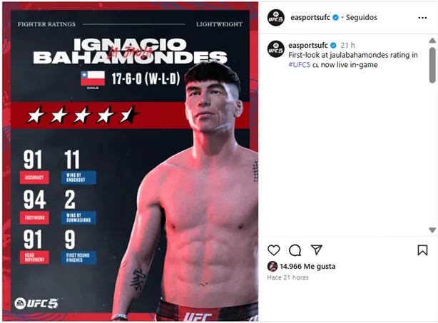 La cuenta oficial de UFC 5 en Instagram le dio la bienvenida al chileno al título con una publicación, donde señaló; “Primer vistazo a la clasificación de “La Jaula” Bahamondes en #UFC5 ahora en vivo en el juego” junto a una imagen donde se ven sus grandes estadísticas, promediando cuatro estrellas y media de un máximo de cinco, además destacan valores como “precisión” (91), “trabajo de pies” (94) y “movimientos de cabeza” (91).