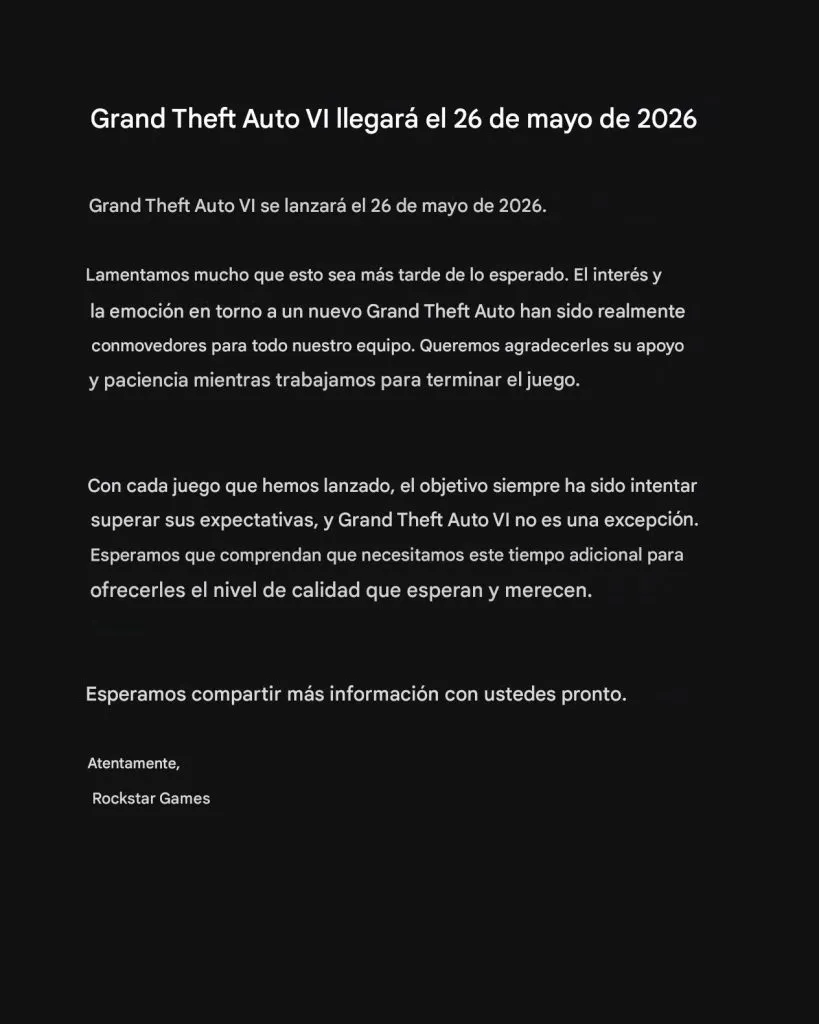 A través de un comunicado la compañía señaló que el objetivo de este aplazamiento es porque “cada juego que hemos lanzado, el objetivo siempre ha sido tratar de superar sus expectativas, y Grand Theft Auto VI no es la excepción”, pidiendo comprensión a los fanáticos y asegurando que el tiempo adicional es necesario para alcanzar los estándares de calidad esperados.
