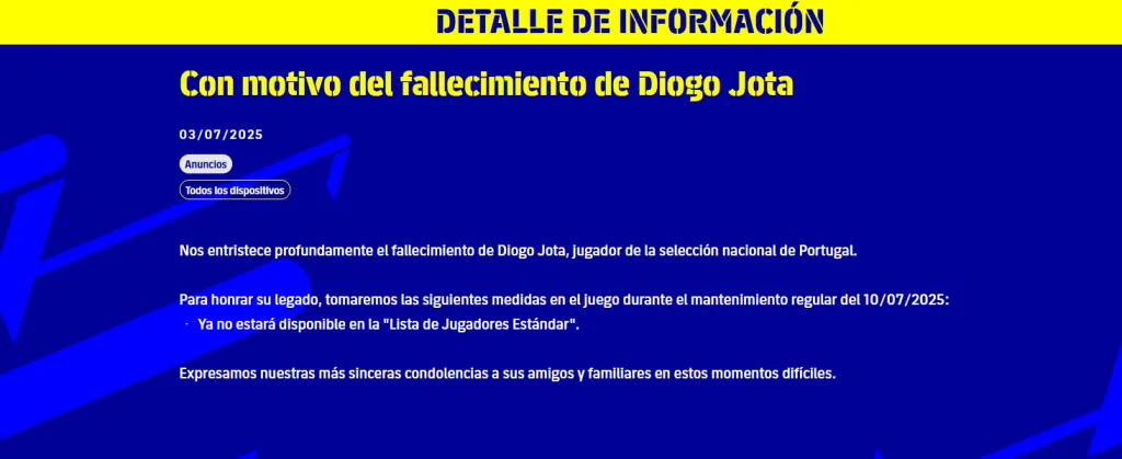 A través de un comunicado de prensa publicado en su sitio web, la empresa de videojuegos nipona señaló: “Con motivo del fallecimiento de Diogo Jota”.