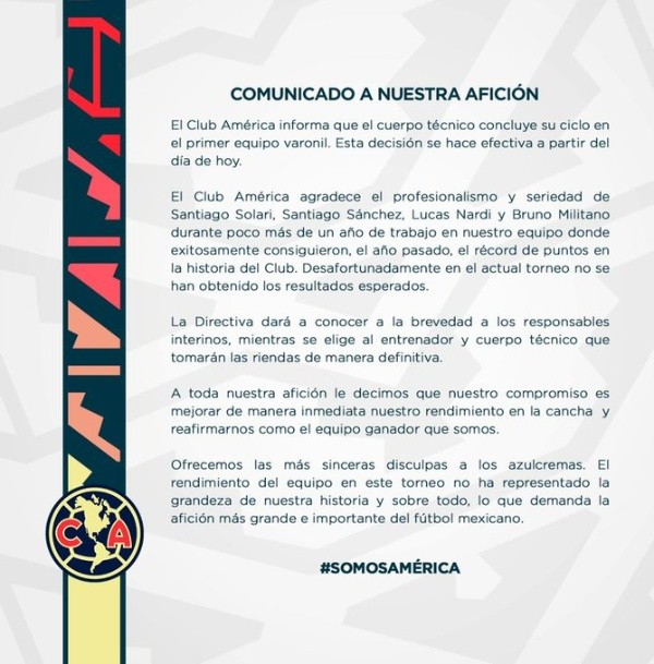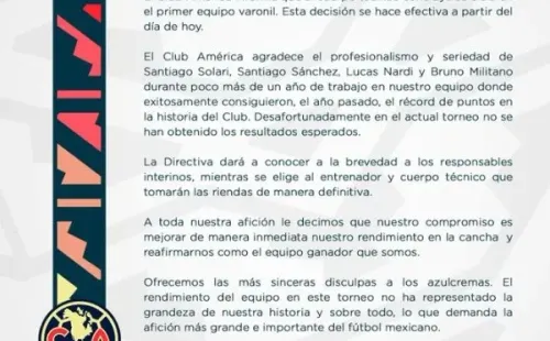 “El Club América informa que el cuerpo técnico concluye su ciclo en el primer equipo varonil. Esta decisión se hace efectiva a partir del día de hoy”, señalaron desde el club. De hecho, se dieron el tiempo hasta de pedir perdón por el presente que viven en la Liga MX.