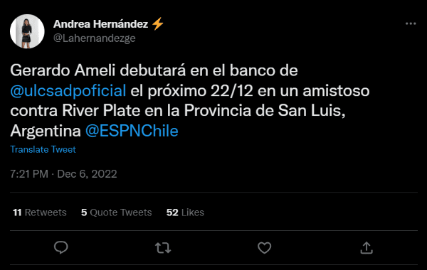 La periodista de ESPN informó a través de su Twitter que uno de los clubes más grandes del fútbol argentino y sudamericano pondrá a prueba a un debutante, pero con experiencia en suelo nacional. La referencia es para Gerardo Ameli, el DT que asumió el mando del plantel profesional de Unión La Calera al cabo del 10° lugar que los Cementeros obtuvieron en el Campeonato Nacional 2022.