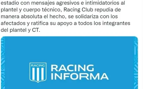 “A raíz de los pasacalles colocados en los accesos al estadio con mensajes agresivos e intimidatorios al plantel y cuerpo técnico, Racing Club repudia de manera absoluta el hecho, se solidariza con los afectados y ratifica su apoyo a todos los integrantes del plantel y CT”, comienzan explicando.
