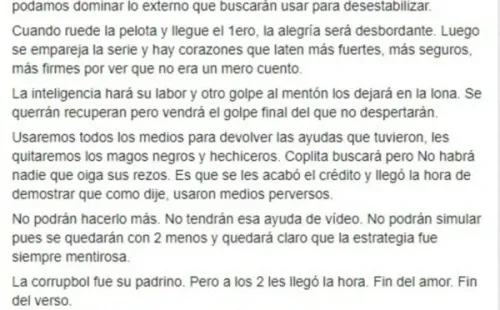 El astrólogo predijo que la victoria será de 4-0 sobre River Plate. “Usaremos todos los medios para devolver la ayuda que tuvieron, les quitaremos los magos negros y hechiceros”, escribe en su red social.