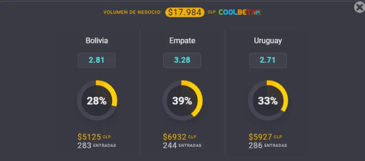 Para el OSO de Coolbet, el favorito para ganar este partido de las Eliminatorias Sudamericanas al Mundial de Qatar 2022 es Uruguay, que paga 2,71 veces lo que juegues, por sobre los 2,81 veces lo que apuestes si piensas que Bolivia se queda con el partido. Ahora, si crees que empatan, paga 3,28 veces.