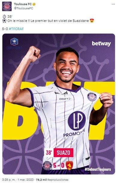 “¡Oh, el misil! El primer gol en los Violets de Suazidane”, publicó la cuenta del pajarito azul del Toulouse para festejar la anotación del chileno en la Copa de Francia.