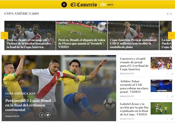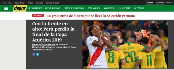 Por su parte, el sitio especializado Depor señaló tras el juego que cayeron “Con la frente en alto: Perú perdió la final de la Copa América 2019”; El Comercio también se limitó a la formalidad indicando que “Perú perdió 3-1 ante Brasil en la final del certamen continental”.