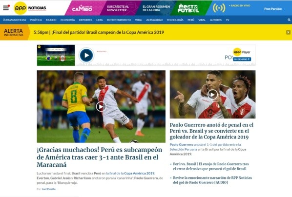 Finalmente, Radio Programas del Perú mostró una mezcla de desazón y orgullo por lo hecho en el certamen, y puso en su nota principal “¡Gracias muchachos! Perú es subcampeón de América tras caer 3-1 ante Brasil en el Maracaná”.