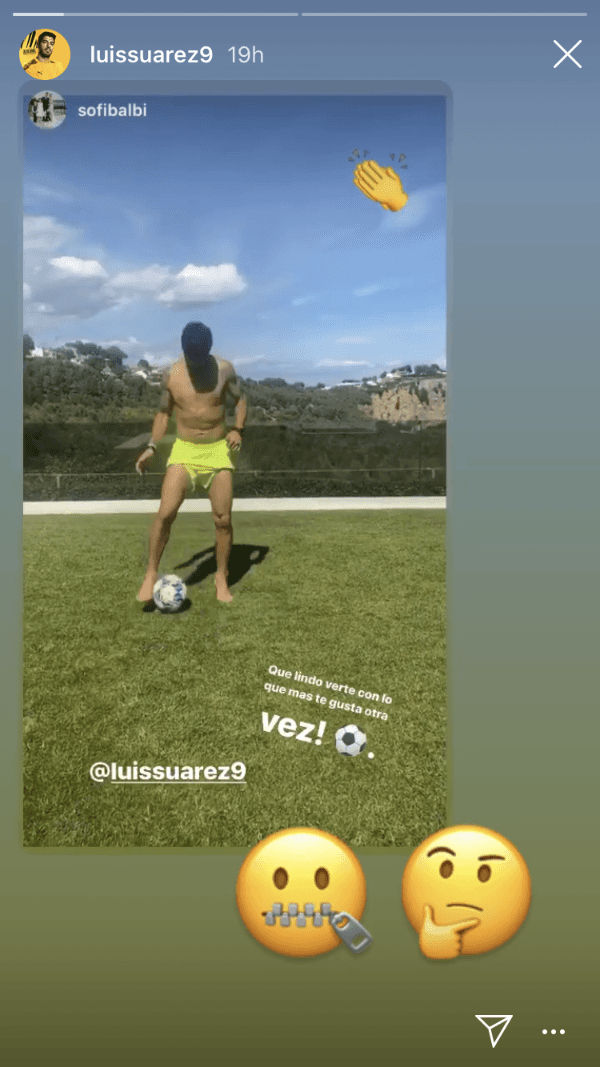 A través de su cuenta de Instagram, Suárez reposteó un video de su pareja en el que aparece a torso descubierto y sin nada de sobrepeso. ¿Pero la respuesta del 9? Dos emoticones: uno sobre cerrar la boca y otro pensativo.