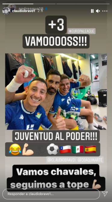 En Instagram el triunfo se celebró con todo, con varias imágenes dentro del camarín y con Bravo siendo protagonista. El chileno apareció en una de las fotos de Andrés Guardado, dándoselas de español y lanzando un “¡Vamos chavales! Seguimos a tope“.