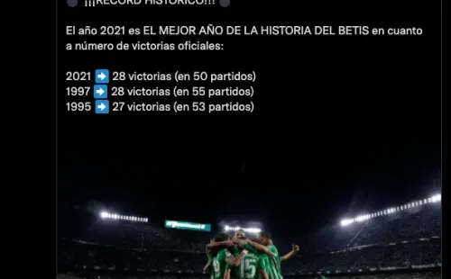 De hecho, este año ha sido catalogado como el mejor en la historia del Betis no solo por el juego, sino también por los números. En 50 partidos ya han conseguido 28 victorias, superando los números de la temporada de 1997 (28 en 55) y 1995 (27 en 53).