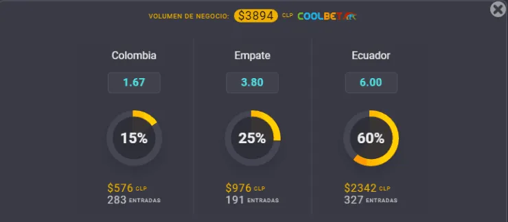 Para el OSO de Coolbet, el favorito para ganar en este partido de las Eliminatorias Sudamericanas al Mundial de Qatar 2022 es Colombia, que paga 1,67 veces lo que juegues, por sobre los 6,00 que paga Ecuador, si crees que ellos vencerán en Barranquilla. Ahora, el empate entre ambos paga 3,80 veces lo que apuestes.
