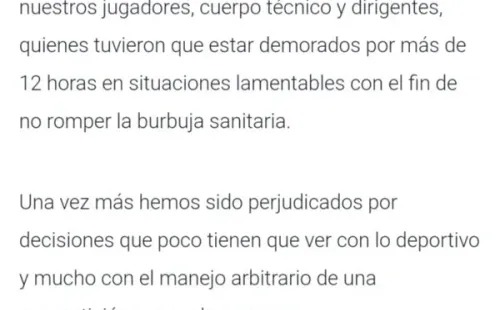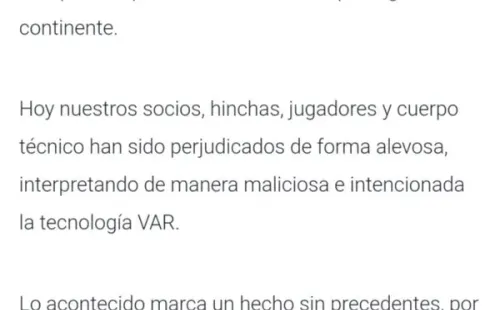 El comunicado indica que “fuimosperjudicados de forma alevosa, interpretando de manera maliciosa e intencionada la tecnología VAR“, y remarca que estas situaciones “dejan en manifiesto el manejo tendencioso de nuestro fútbol continental”.