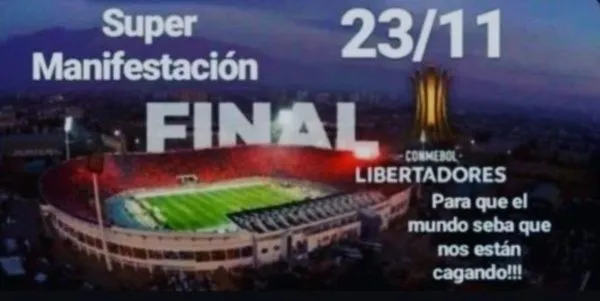El anuncio llega después de un fin de semana en el que se viralizaron anuncios de una “súper manifestación” para el 23 de noviembre con la vista puesta en el encuentro entre River Plate y Flamengo, que ha circulado vía redes sociales.