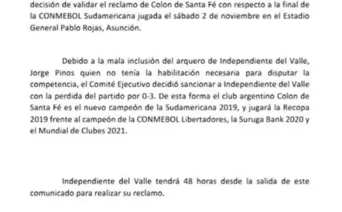 Llamó la atención la viralización en redes sociales de una supuesta carta suscrita por el presidente de la Confederación del Fútbol Sudamericano, Alejandro Domínguez y en donde daba como nuevo campeón de la Copa Sudamericana a Colón de Santa Fe en desmedro de Independiente del Valle.
