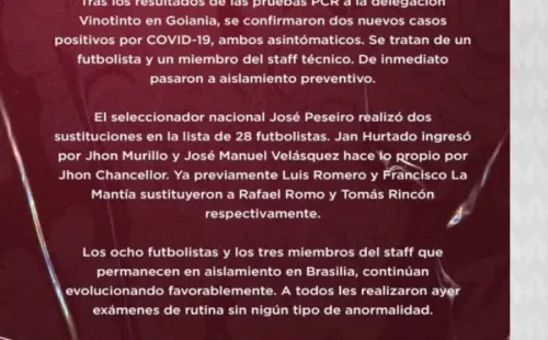 Este jueves, horas antes del compromiso ante Colombia, la Vinotinto dio a conocer de dos positivos más en la última ronda de pruebas PCR. Según dieron a conocer las redes sociales de la selección, uno de ellos es otro jugador mientras que el restante se trata de un miembro del cuerpo técnico.