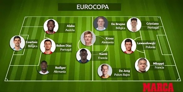 Europa, con un 3-4-3 está conformado por Thibaut Courtois; Antonio Rüdiger, Ruben Dias y David Alaba; Frenkie de Jong, N’Golo Kanté, Toni Kroos y Kevin De Bruyne; Kylian Mbappé, Robert Lewandowski y Cristiano Ronaldo.