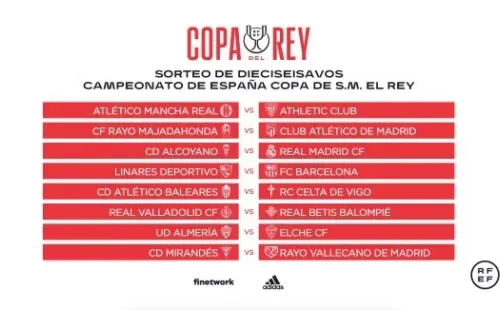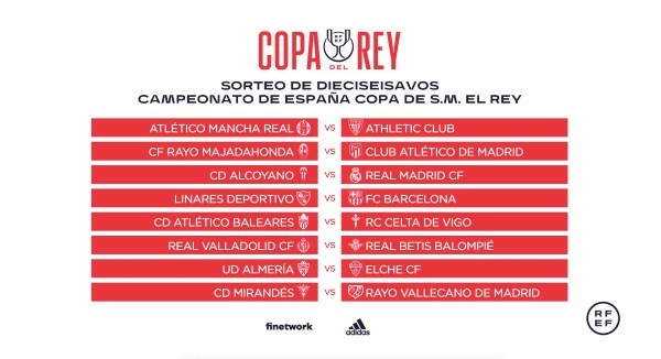 Entre tanto, Barcelona irá contra Linares, de la tercera división, mientras que Atlético de Madrid chocará ante el Rayo Majadahonda de la misma categoría. Athletic de Bilbao enfrentará al sopresivo Atlético Mancha Real, único de cuarta división con vida, que viene de echar al Getafe.