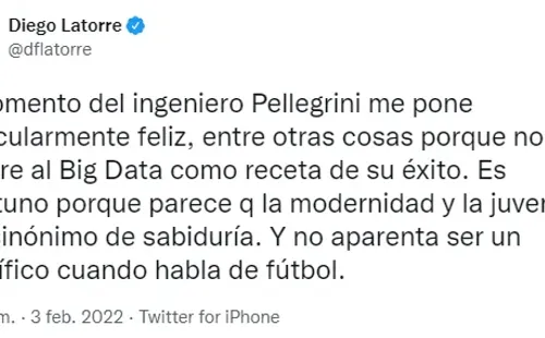 Gambetita no se guardó ningún halago hacia el técnico chileno y su tremendo andar con los andaluces. “El momento del ingeniero Pellegrini me pone particularmente feliz, entre otras cosas porque no recurre al Big Data como receta de su éxito”, escribió quien fuera jugador de Boca Juniors en su cuenta de Twitter.
