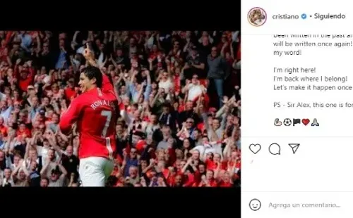 “Mi primera Liga doméstica, mi primera Copa, mi primera convocatoria a la selección portuguesa, mi primera Champions League, mi primera Bota de Oro y mi primer Balón de Oro, todos nacieron de esta conexión especial entre los Diablos Rojos y yo. La historia se ha escrito en el pasado y la historia se escribirá una vez más. ¡Tienes mi palabra! ¡Estoy aquí! ¡Regresé a donde pertenezco! ¡Hagamos que suceda una vez más! PD: Sir Alex, este es para ti”, afirmó Cristiano Ronaldo.