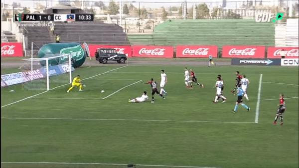 El lateral por esa zona del Tino, Brayan Véjar, inició la acción que tomó tintes peligrosos cuando ingresó con balón dominado al área César Cortés, quien disparó al arco y allí su disparo fue repelido por Brayan Cortés.
