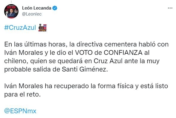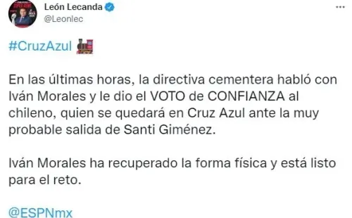 “En las últimas horas, la directiva cementera habló con Iván Morales y le dio el voto de confianza al chileno, quien se quedará en Cruz Azul ante la muy probable salida de Santi Giménez. Iván Morales ha recuperado la forma física y está listo para el reto”, escribió el reportero en Twitter.