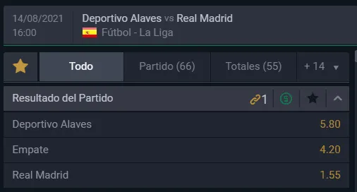 Para Betsala, el gran favorito para ganar esta tarde en el inicio de la Liga de España es Real Madrid, cuya victoria paga 1,55 veces lo que juegues, por sobre los 5,80 que paga Deportivo Alavés si ellos, como local, se quedan con el triunfo. Ahora, si piensas que el partido termina en empate, paga 4,20 veces lo que juegues.