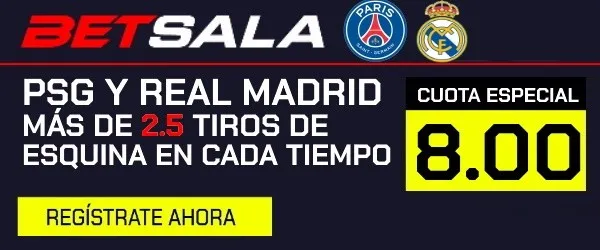Ahora puedes jugar con la cuota especial que tiene Betsala para esta jornada. Si crees que el Real Madrid y PSG tendrán más de 2,5 tiros de esquina en cada tiempo, paga 8,00 veces lo que juegues en esta jornada.