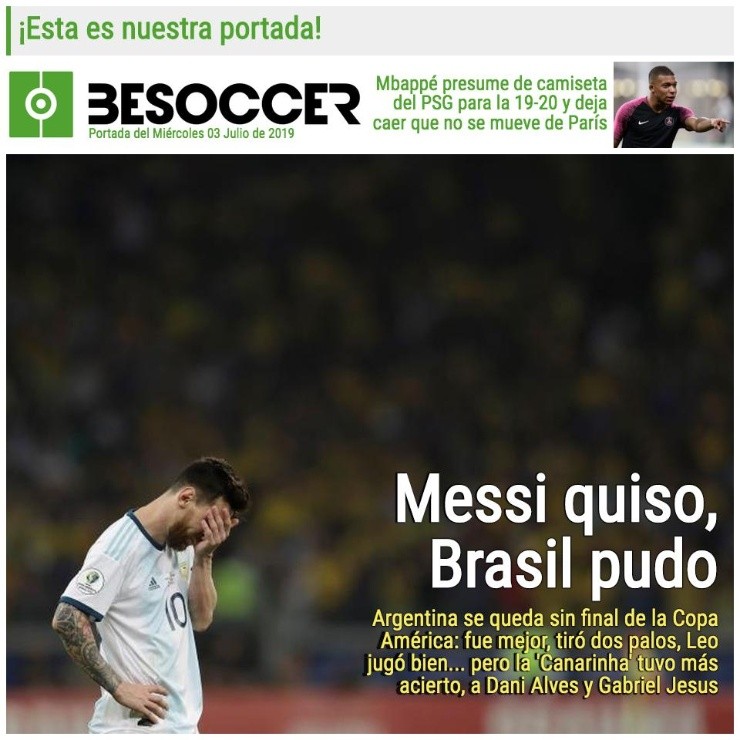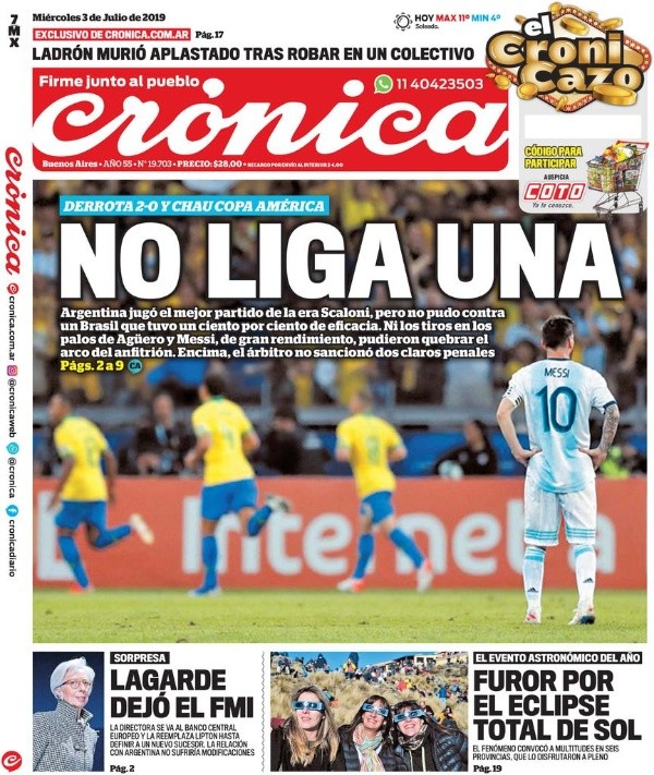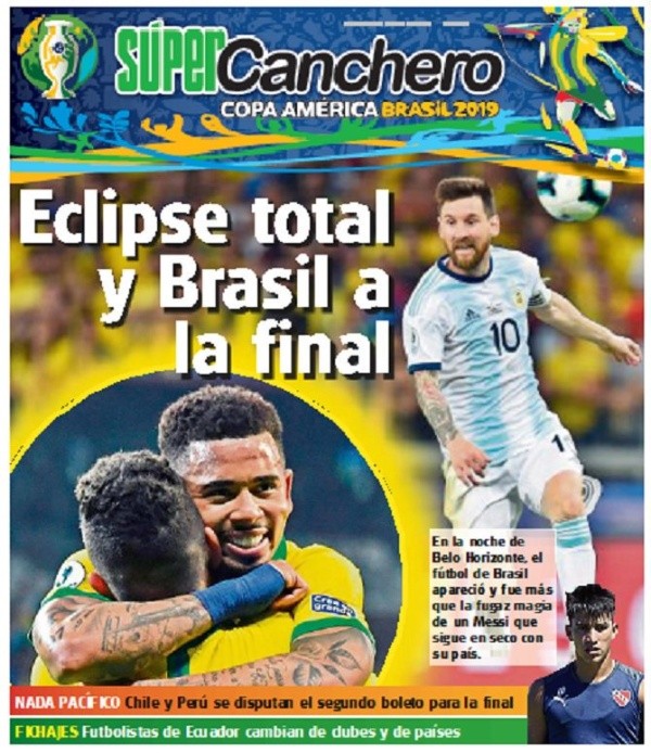 El resto de la prensa argentina combinó la queja con la alabanza a Lionel Messi. “Ni los tiros en los palos de Agüero y Messi, de gran rendimiento, pudieron quebrar el arco del anfitrión”, lamenta diario Crónica. “Eclipse de gol”, fue el otro titular.