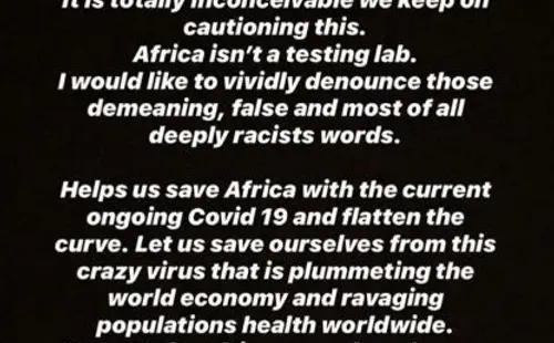 El marfileño aseguró en su cuenta de Instagram que “África no es un laboratorio de pruebas. Me gustaría denunciar vivamente esas palabras denigrantes, falsas y, sobre todo, profundamente racistas.”