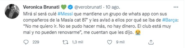“No me quiero ir. No se pudo hacer más, no hay dinero. El club está muy mal y no pueden renovarme”, fue el mensaje de Messi en WhatsApp según Brunati.