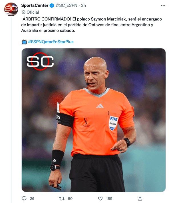 El referee designado por la FIFA para el partido de la albiceleste y los socceroos es Szymon Marciniak, polaco de 41 años tendrá susegundo partido al mando luego del triunfo de Francia por 2 a 1 ante Dinamarca, donde mostró tres tarjetas amarillas en el primer tiempo.