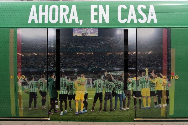 El medio de transporte sevillano fue “pintado” con el escudo del Real Betis y frases como “ahora en casa” y “como siempre, con los nuestros”.