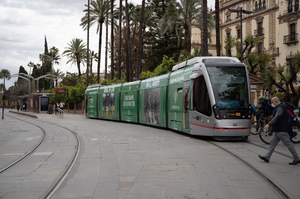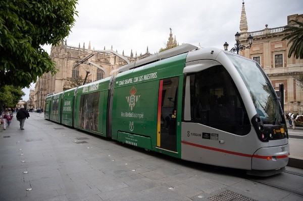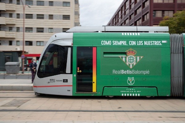 El tranvía del Real Betis se pone la camiseta del Real Betis para la final de la Copa del Rey.