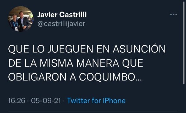 “Que lo jueguen en Asunción de la misma manera que obligaron a Coquimbo“, fue el primer mensaje de Castrilli, haciendo alusión a lo que sucedió con el equipo pirata en la Copa Sudamericana, cuando tuvo que recibir por la semifinal del torneo a Defensa y Justicia en Paraguay.
