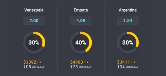 El OSO de Coolbet te cuenta que el favorito para ganar en este partido que comienza a las 20.00 hrs es Argentina, que paga 1,54 veces lo que juegues por sobre los 7,00 que paga Venezuela, si crees que los locales dan la sorpresa. Ahora, el empate entre ambos paga 4,00 veces lo que juegues.