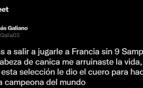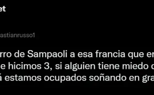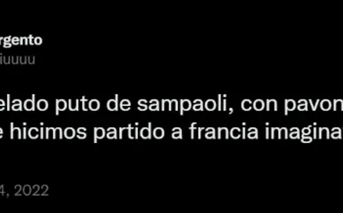 “Si con el pelado puto de sampaoli, con Pavón y Mercado le hicimos partido a Francia,imagínate ahora”, apuntó otro fanático. “Cómo vas a salir a jugarle a Francia sin 9, Sampaoli pelado cabeza de canica, me arruinaste la vida.Lo peor es que a esta selección le dio el cuero para hacerle 3 goles a la campeona del mundo”, aseguró Tomás Galiano, quien todavía rememora con mucha bronca aquella oncena que a gran parte del vecino país le pareció inentendible.