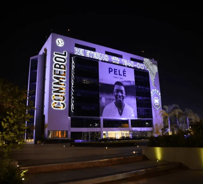 4:15 | El edificio de la Conmebol en Luque, Paraguay, se iluminó con la imagen de Pelé en homenaje.