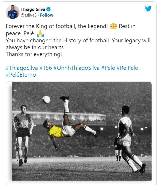 5:30 | Thiago Silva no se ahorró elogios al momento de hablar de Pelé. “¡Para siempre seráel Rey del futbol, la Leyenda! Descanse en paz, Pelé. Usted cambió la historia del futbol y esta estará siempre viva en nuestros corazones. ¡Gracias por todo!”, dijo el defensor.