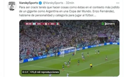 “Para ser crack tenés que hacer cosas como éstas en el contexto más jodido de un gigante como Argentina en una Copa del Mundo. Enzo Fernández, hablame de personalidad y categoría para jugar al fútbol”, comentó el periodista Juan Pablo Varsky.
